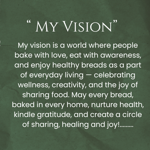 My vision is a world where people bake with love, eat with awareness, and enjoy healthy breads as a part of everyday living — celebrating wellness, creativity, and the joy of sharing food. May every bread, baked in every home, nurture health, kindle gratitude, and create a circle of sharing, healing and joy!………