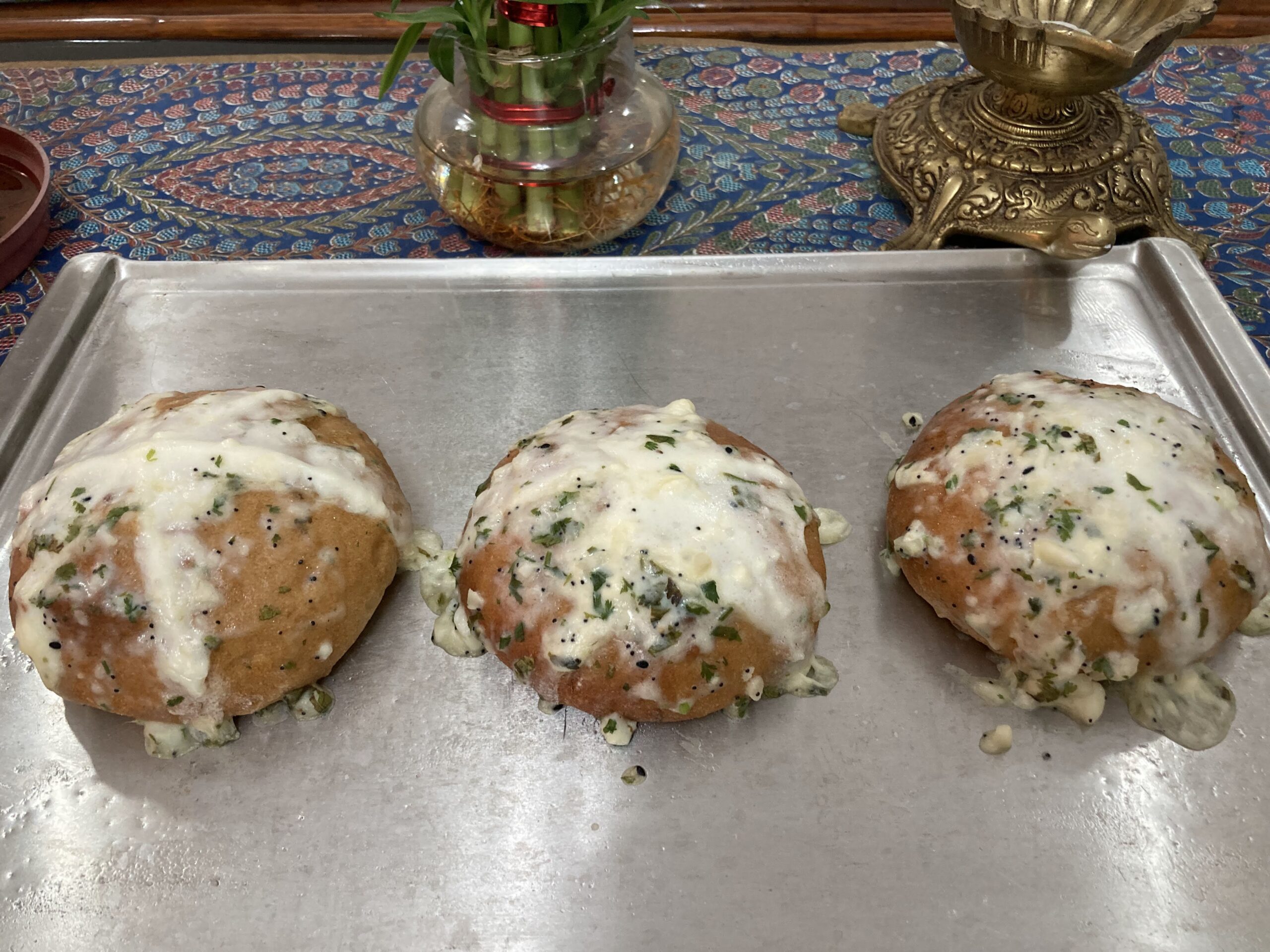 To make Buns -healthy ones- check our Buns recipe . They can be slightly bigger than the regular buns, like big burger buns. They have to be cut open in wedges (six), making sure that they are joint at the root/ base. Next, we whip together Cream cheese and Cream (whipping or other). Then fill this creamy mixture in the wedges – up to the brim i.e. generously. Finally, dunk then upside down as in diving, in the garlic butter custard, then re-bake for 10 minutes, such that the cream cheese melts and sinks in the wedges making the buns swell and soften from inside and the garlic butter layer making the buns’ crust, crisp and crusty. Lastly, sprinkle some fresh chopped herbs on the buns and enjoy the sweet- savory exotic taste.